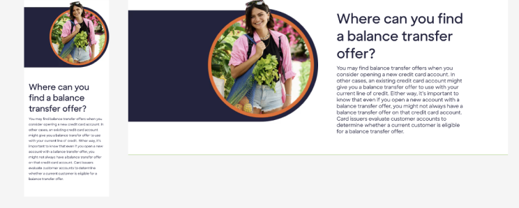 With our SEO redesigns, we sometimes run into the issue of having long, copy heavy sections that are typically overlooked by our users. Usually they scroll past large sections with lots of wording, as we saw when researching heat maps of the original Balance Transfer page. When creating redesigns, I found the opportunity to utilize two components I had built with the development team into the design. These were two new components where I was the Lead Designer on: leading reviews, presentations, doing research, and making iterations based off feedback.